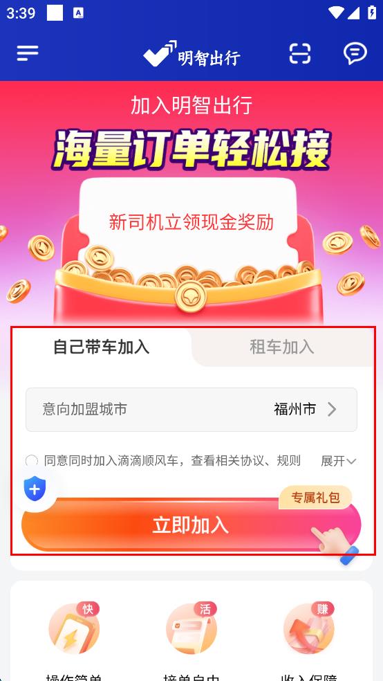 1、打開明智出行軟件,進入“自己帶車加入”頁面,選擇意向加盟城市,若當前顯示城市不是目標城市,點擊城市選擇框,輸入并選擇目標城市。