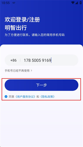 1、打開明智出行,進入登錄注冊頁面,找到手機號輸入框,準備填寫常用手機號碼。