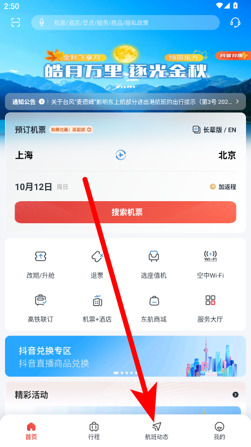 1、打開東方航空App,點(diǎn)擊底部菜單欄中的航班動(dòng)態(tài)選項(xiàng)。