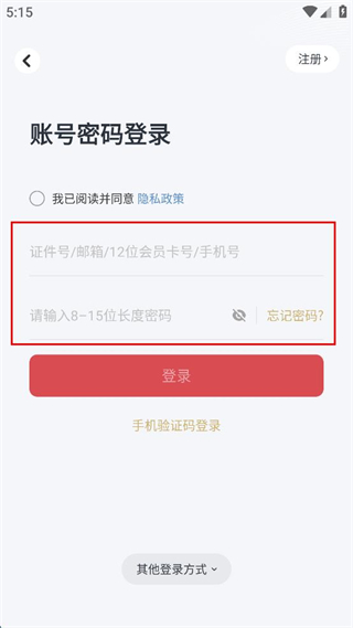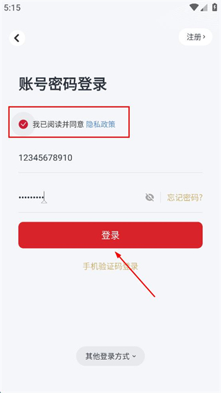 4、勾選已閱讀并同意隱私政策,填寫賬號(hào)與密碼,點(diǎn)擊登錄按鈕完成該應(yīng)用的登錄。