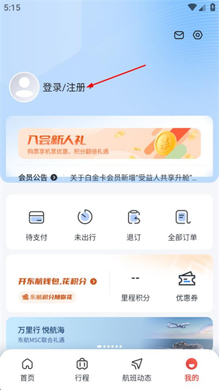 2、進(jìn)入我的頁(yè)面,看到登錄注冊(cè)入口及各類訂單功能,點(diǎn)擊登錄注冊(cè)區(qū)域進(jìn)入登錄頁(yè)面。