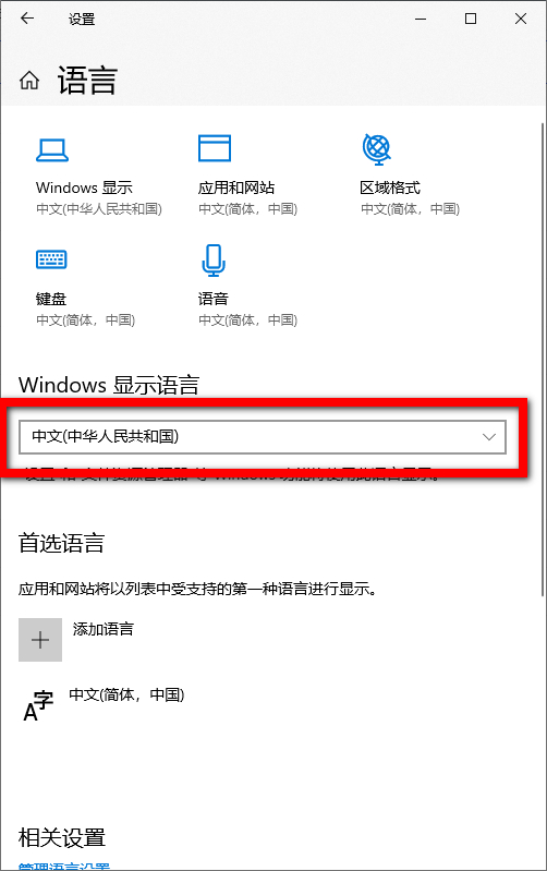 4、在語(yǔ)言設(shè)置頁(yè)面找到“Windows顯示語(yǔ)言”下拉框,選擇中文,即可設(shè)置為中文模式。