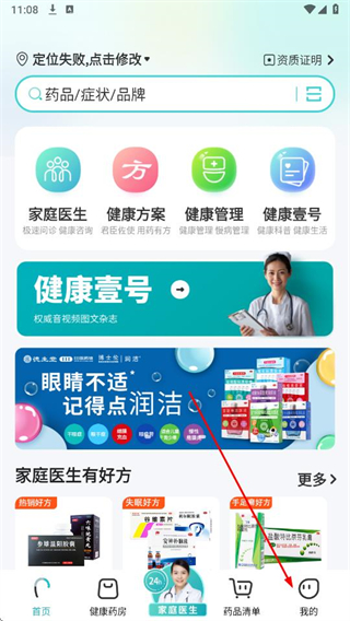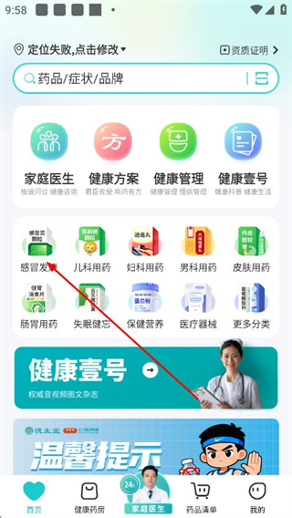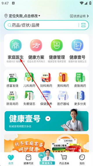 1、打開111醫(yī)藥館APP,點擊首頁家庭醫(yī)生,進(jìn)入家庭醫(yī)生頁面。