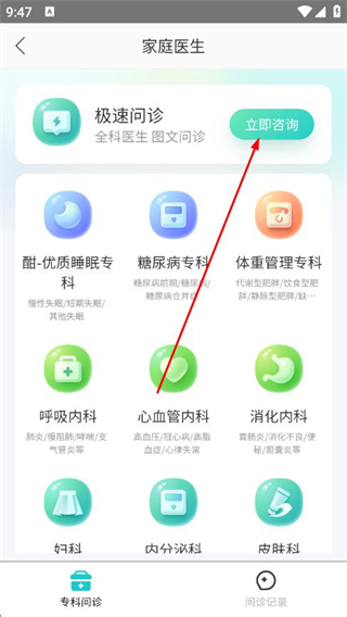 2、在家庭醫(yī)生頁面點擊極速問診的立即咨詢,進(jìn)入極速問診頁面。