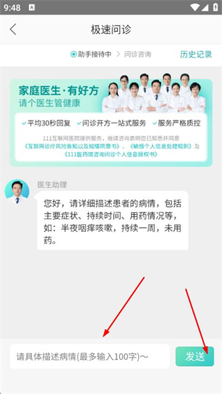 3、在輸入框中詳細(xì)描述病情后,點擊發(fā)送,即可向醫(yī)生問診。