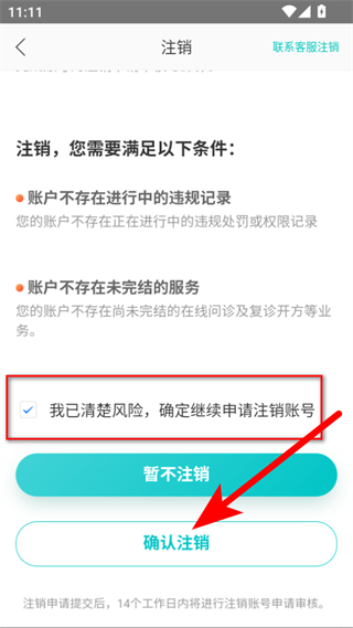 4、在注銷頁面,勾選“我已清楚風(fēng)險,確定繼續(xù)申請注銷賬號”后,點擊確認(rèn)注銷按鈕,即可提交賬號注銷申請。