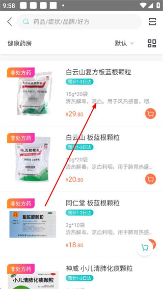 2、在健康藥房頁面找到目標(biāo)藥品,點擊進(jìn)入藥品詳情頁。