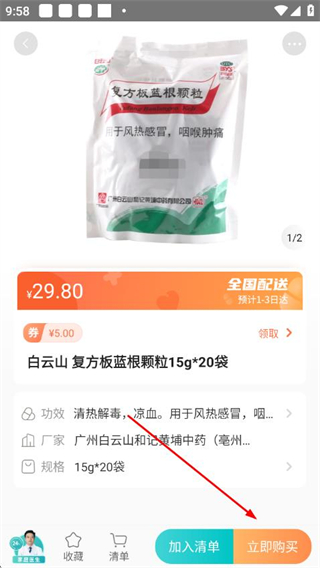 3、在藥品詳情頁點擊立即購買,完成下單、支付等操作,完成購藥。