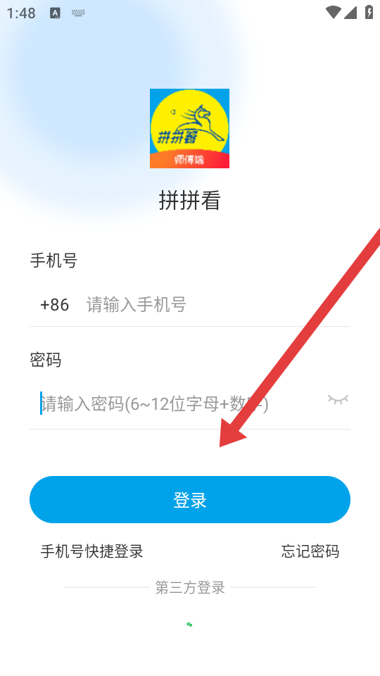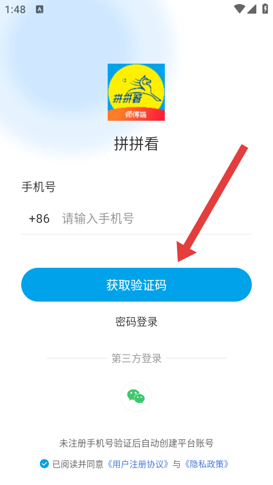 1、在拼拼看師傅端app登錄頁頁輸入手機(jī)號,點(diǎn)擊獲取驗證碼,以短信驗證方式啟動登錄流程。