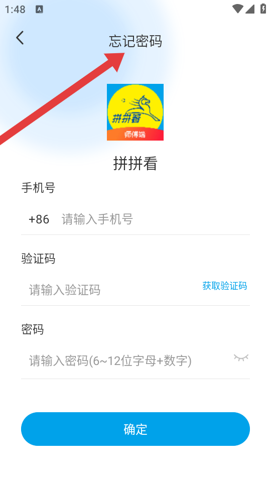 3、進(jìn)入忘記密碼的界頁,填寫手機(jī)號、驗證碼,設(shè)6~12位字母+數(shù)字的新密碼,點(diǎn)擊確定重置密碼。
