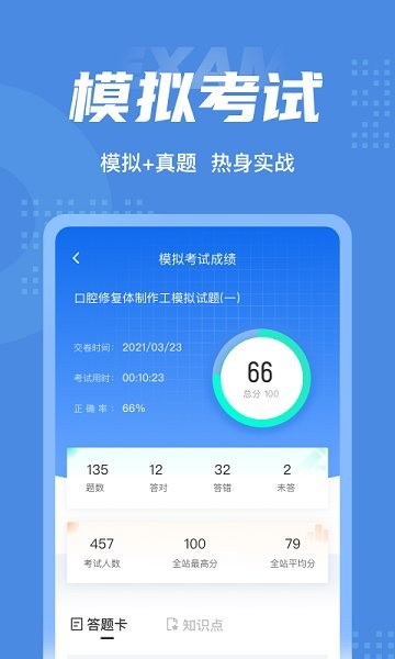 口腔修復(fù)體制作工題庫內(nèi)含考點(diǎn)練習(xí),通用卷以及地區(qū)卷模擬練習(xí),以及按照固定考試比重的隨機(jī)式的抽題的真題考場,成績單實(shí)時(shí)記錄考試數(shù)據(jù),一點(diǎn)一滴的反饋考生近期學(xué)習(xí)狀態(tài)以及自我正確率的提升,給予考生通過考試的信心。