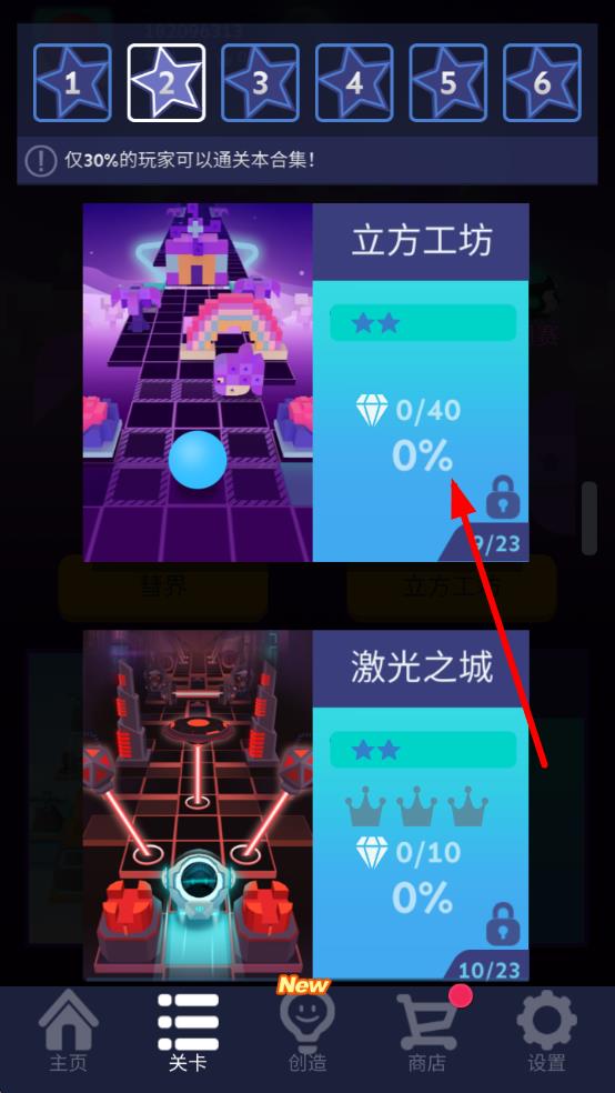 1、打開滾動的天空游戲,在主界面點擊底部關卡按鈕選擇關卡。