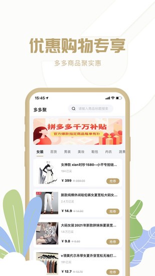 多多聚app是非常好用的一款手機購物類型的軟件,在這里用戶們能夠以超低的價格購買到超多的商品,超多種類的商品在這里全都能夠找到服裝、百貨、美妝、箱包、鞋子、佩飾、內(nèi)衣、蔬果、零食等等等等全都能夠在這里找到,讓用戶們能夠體驗到一站式購物的方便快捷,還能夠讓用戶們省下超多的錢。