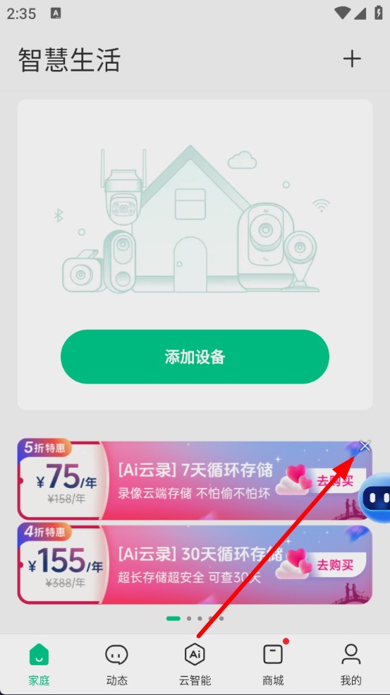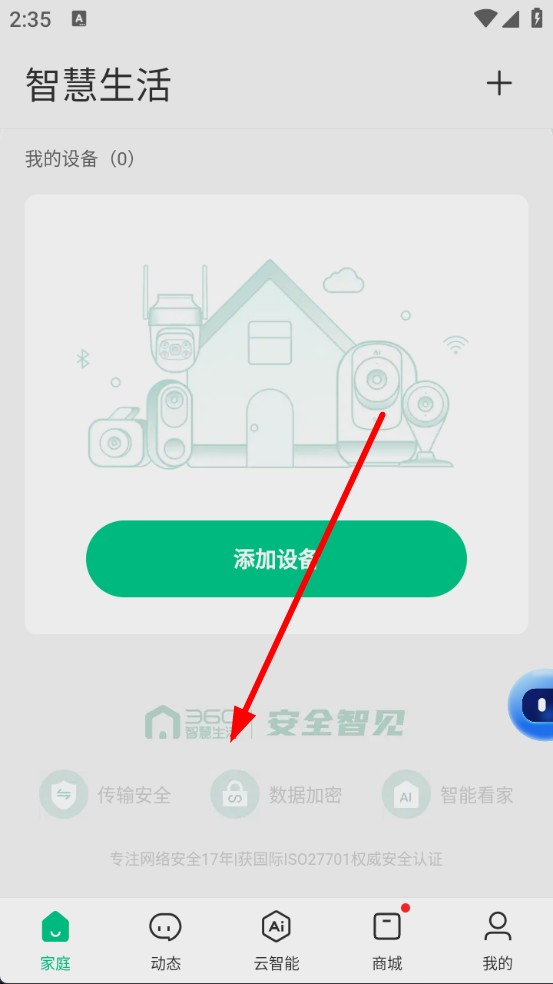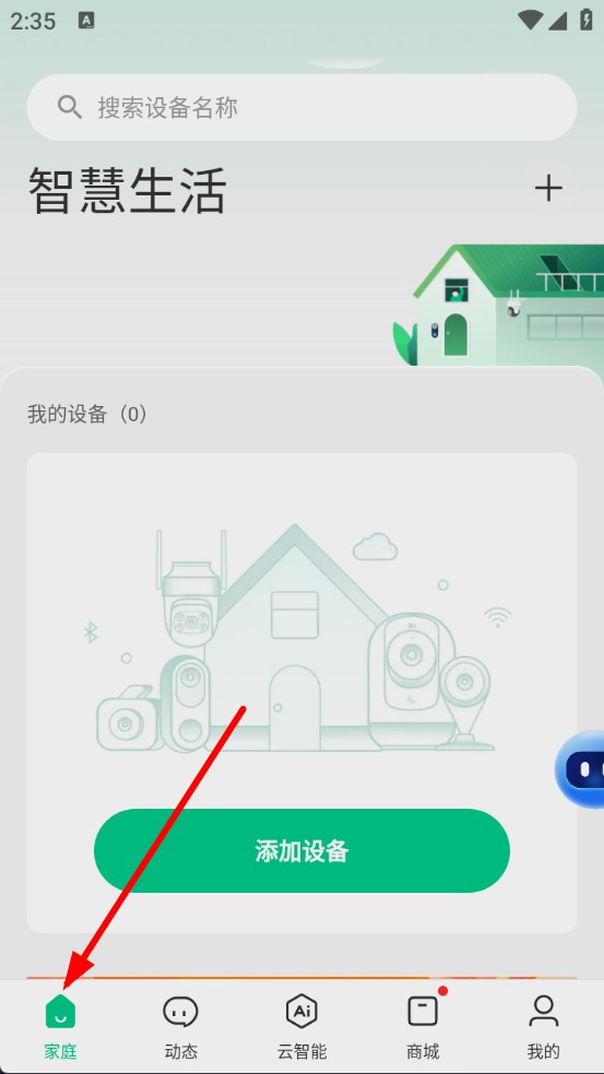 1、打開(kāi)360智慧生活A(yù)PP,進(jìn)入底部導(dǎo)航欄的家庭頁(yè)面。