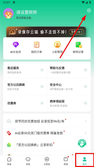 1、打開(kāi)360智慧生活app,進(jìn)入我的頁(yè)面后點(diǎn)擊右上角設(shè)置圖標(biāo),進(jìn)入設(shè)置界面。