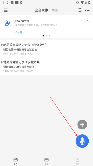 1、打開隨聲鹿應(yīng)用,點(diǎn)擊右下角藍(lán)色麥克風(fēng)圖標(biāo)開始錄制音頻。