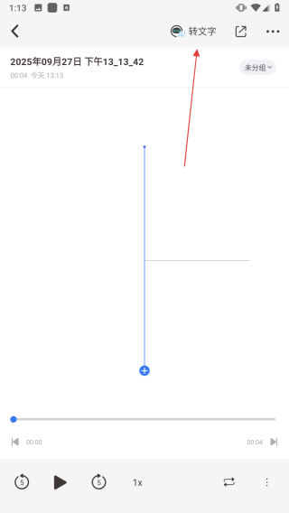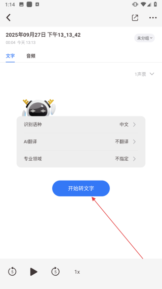 3、在音頻播放頁(yè)面,點(diǎn)擊頂部的轉(zhuǎn)文字按鈕,進(jìn)入轉(zhuǎn)文字設(shè)置界面。