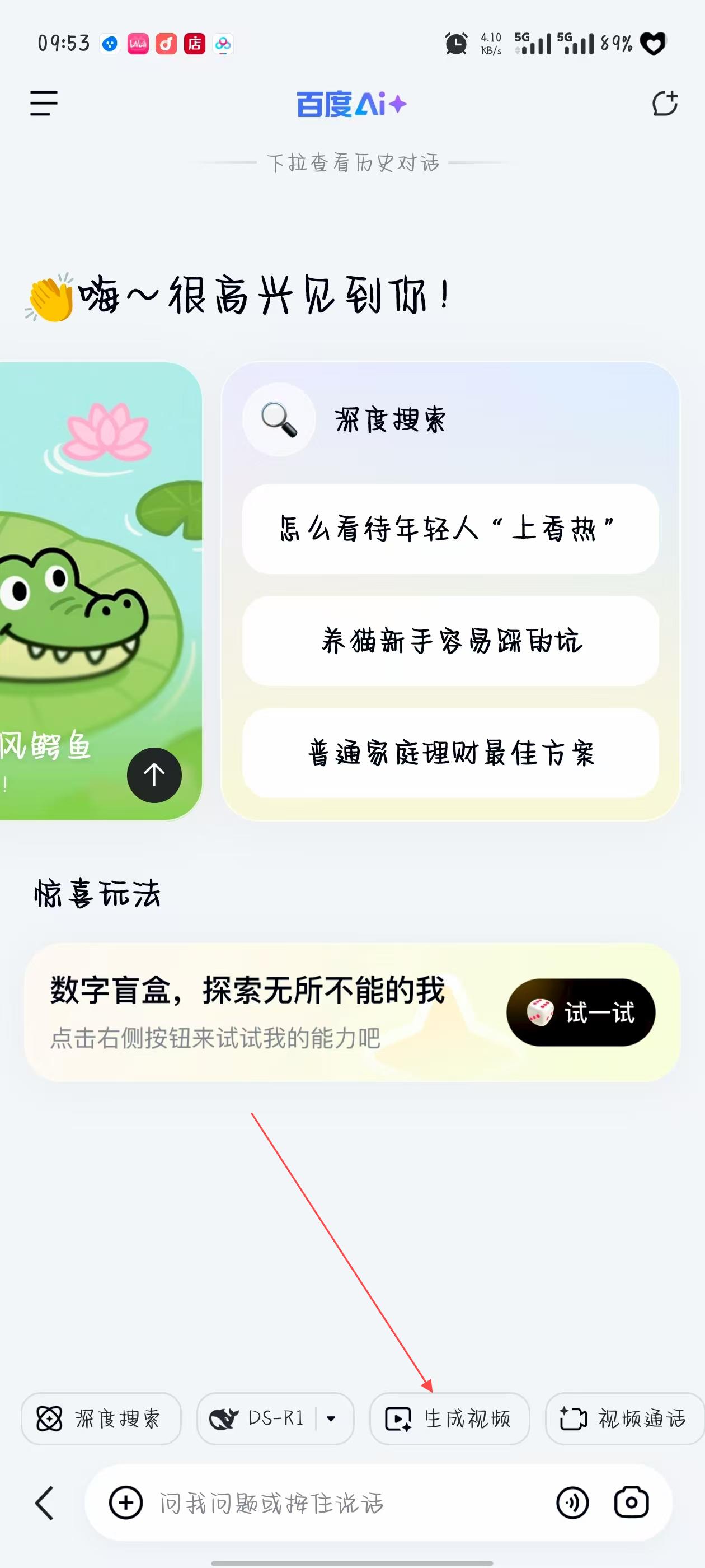 1、打開百度APP,點擊底部導航欄中的AI+進入相關(guān)界面,在下方功能欄里找到并點擊生成視頻按鈕。