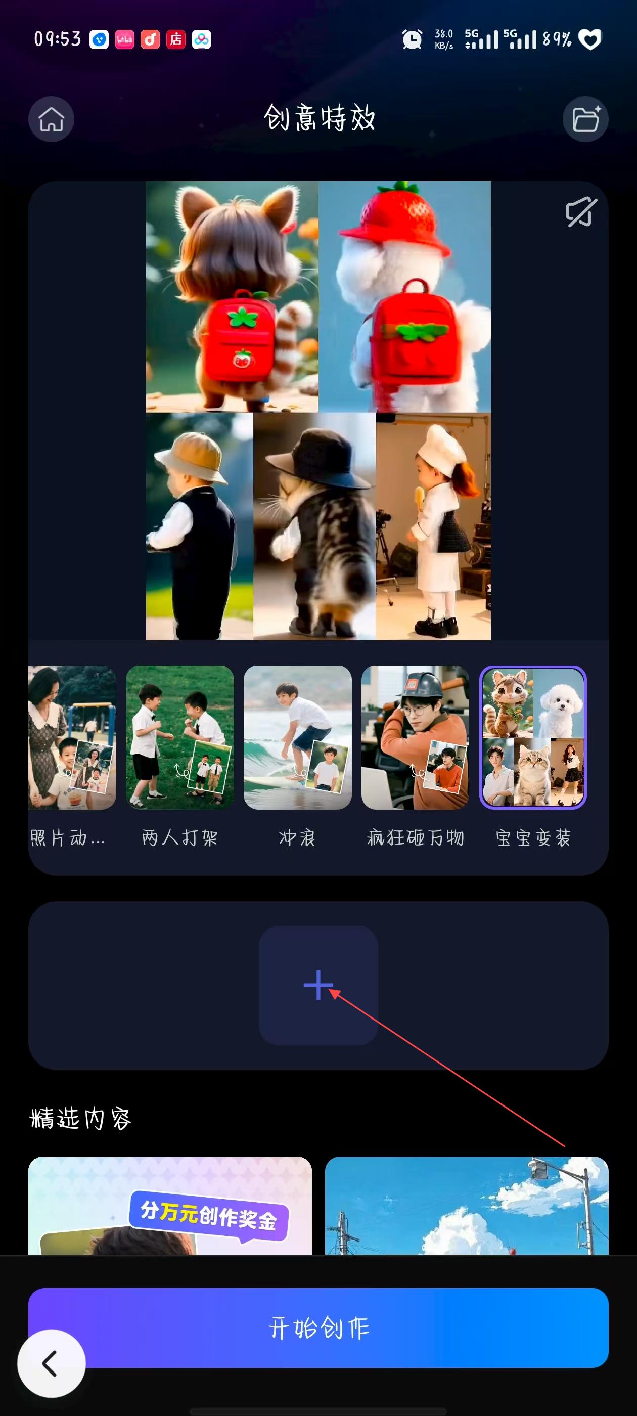 2、進入創(chuàng)意特效頁面后,瀏覽各種特效模板,選擇自己喜歡的視頻特效模板,點擊模板下方的+號,上傳需要用于生成視頻的圖片等素材。