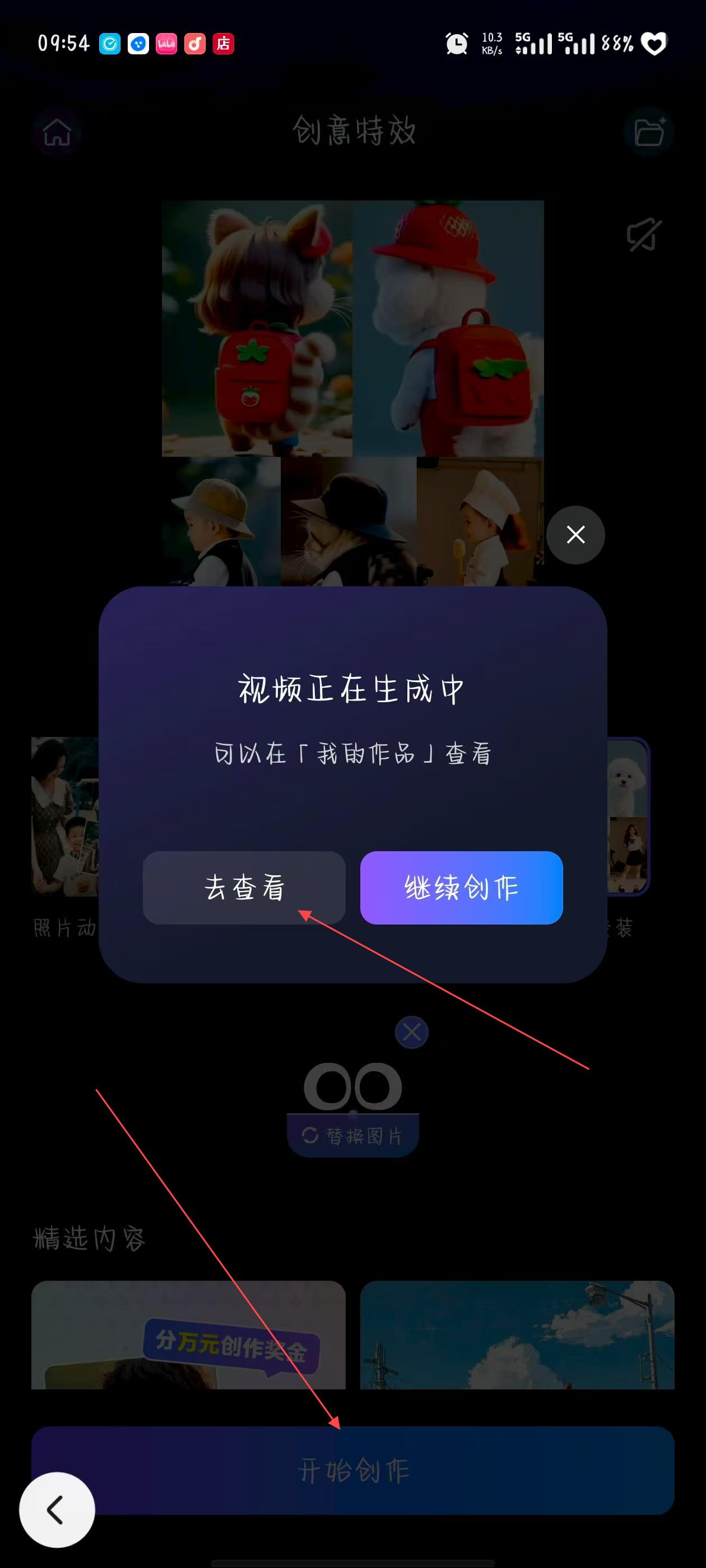 3、上傳完素材后,點擊底部的開始創(chuàng)作按鈕,百度APP就會開始生成視頻,等待視頻生成完成,在彈出的提示框中點擊去查看,就能查看生成好的視頻。