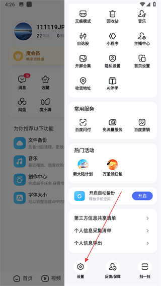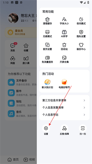 2、在功能菜單中點擊設(shè)置選項,進入設(shè)置頁面。
