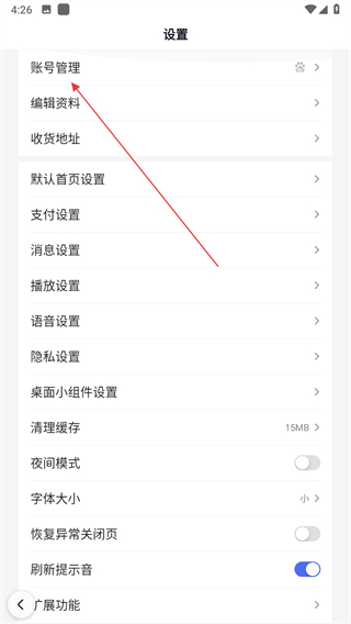 3、在設(shè)置頁面,點擊賬號管理選項。