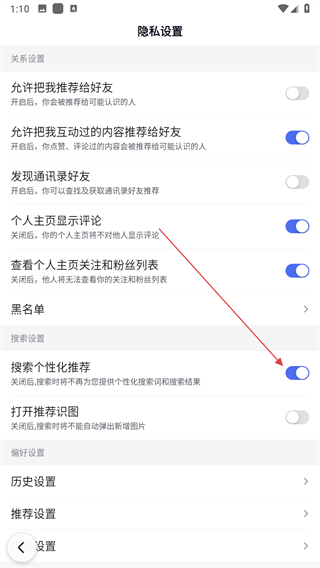 4、找到搜索個性化推薦選項,點擊開關(guān)按鈕將其開啟。
