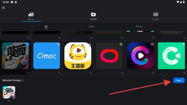 3、進(jìn)入素材選擇頁(yè),選中需編輯的視頻/圖片,點(diǎn)擊Next下一步。