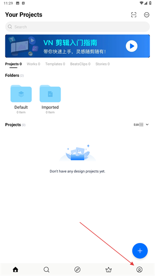1、打開(kāi)vn視頻剪輯的應(yīng)用,在首頁(yè)點(diǎn)擊底部人像的圖標(biāo)。