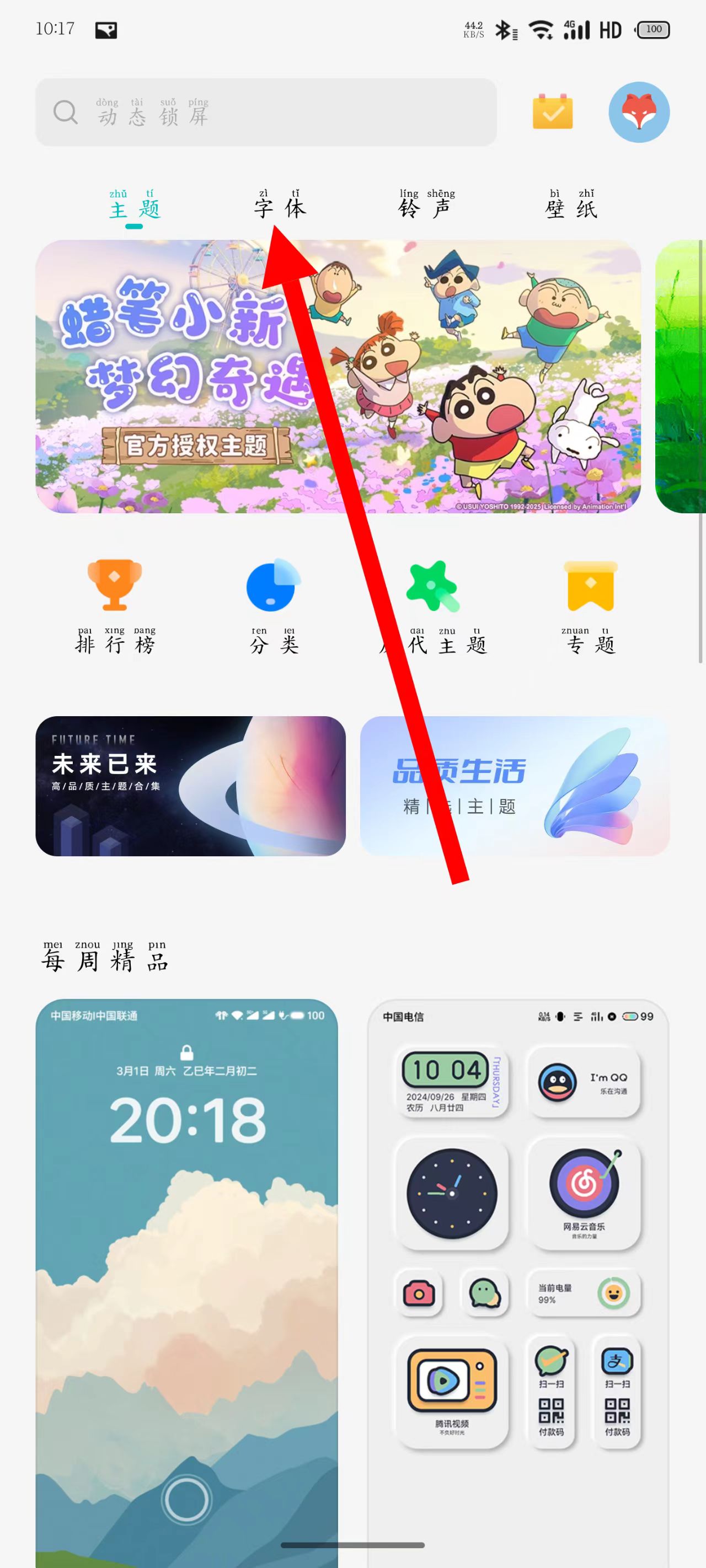 1、打開主題庫(kù)應(yīng)用,點(diǎn)擊頂部“字體”選項(xiàng)。