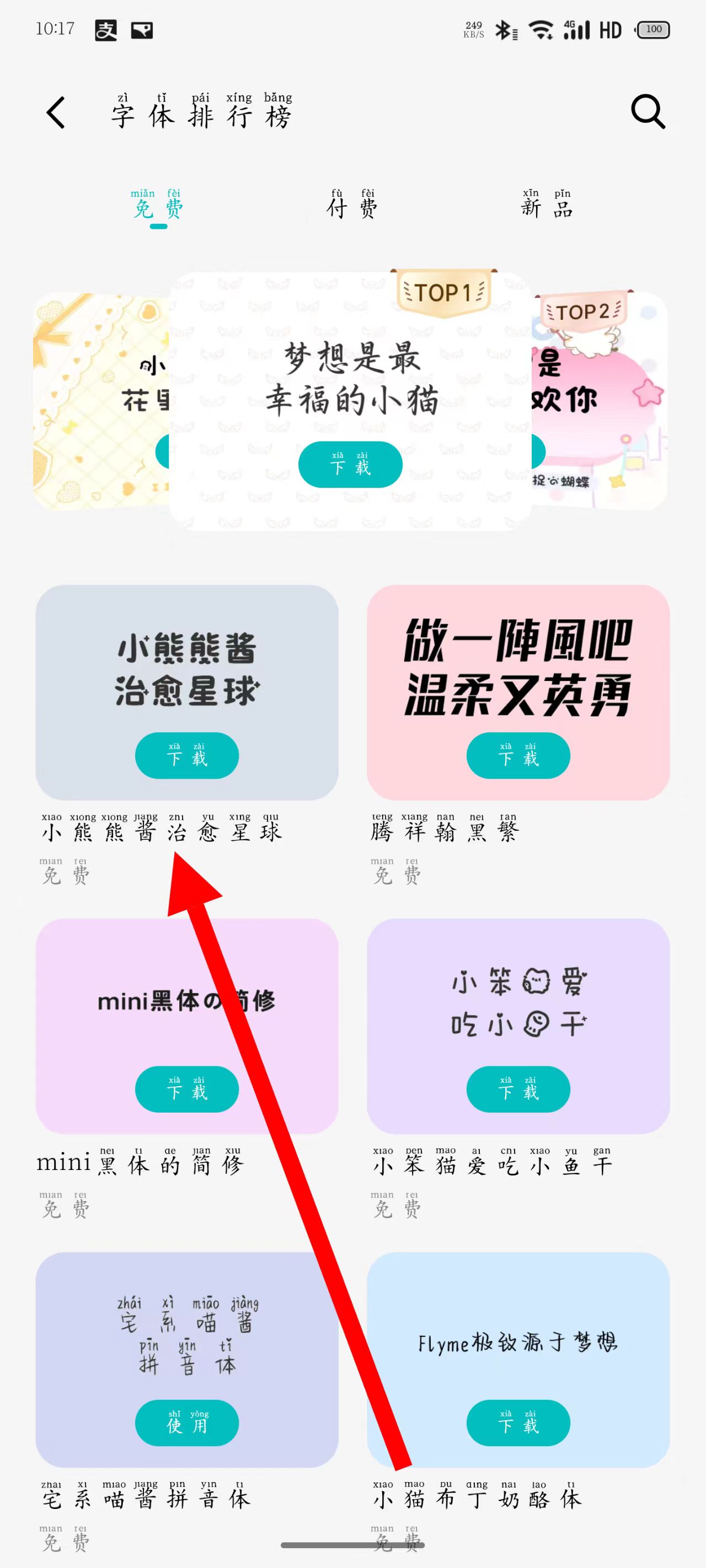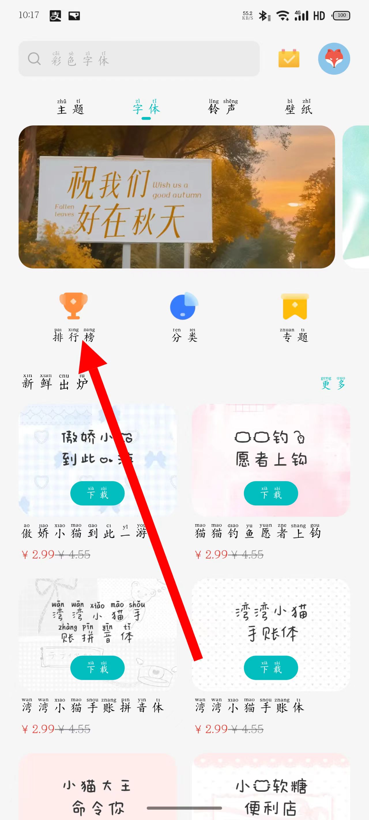 2、進(jìn)入字體界面后,點(diǎn)擊“排行榜”或其他分類選項(xiàng)查找喜歡的字體。