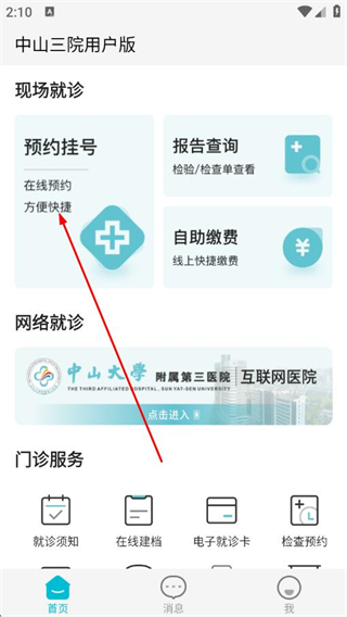 1、打開中山三院用戶版APP,在首頁點擊預(yù)約掛號。