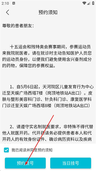 2、在預(yù)約須知頁面,勾選約須知后,點擊預(yù)約掛號按鈕。