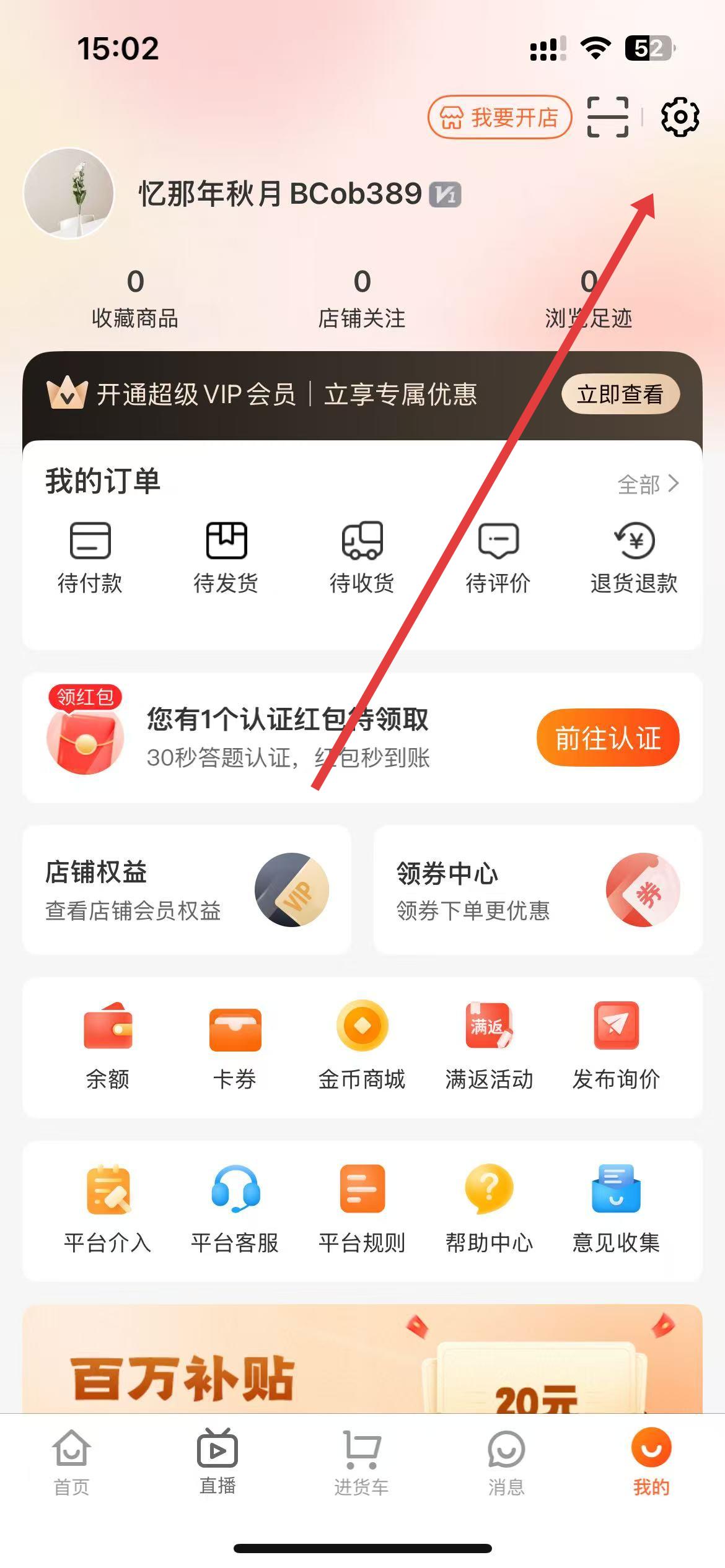 1、打開批批網(wǎng)APP,點擊底部導(dǎo)航欄中的我的選項,在我的頁面右上角,點擊齒輪圖標(biāo)進入到設(shè)置界面。