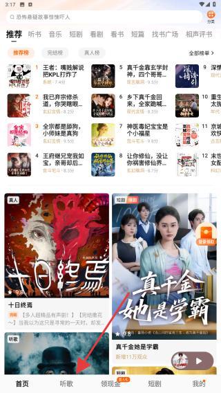 1、打開番暢聽APP,在首頁下方導(dǎo)航欄中點擊聽歌的標(biāo)簽。