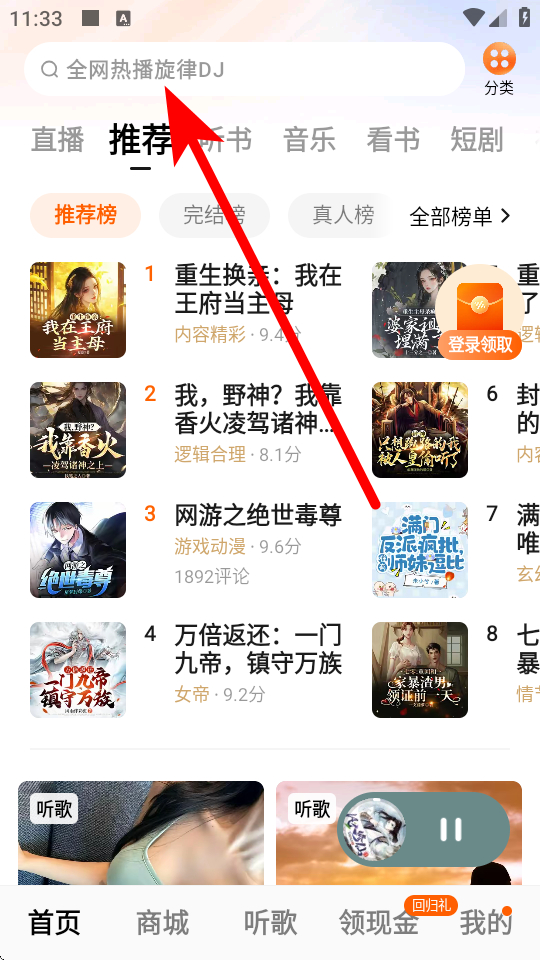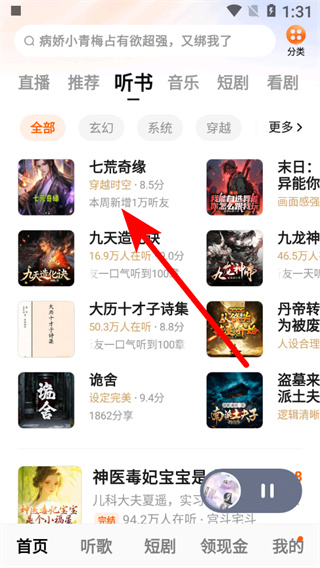 1、在番暢聽推薦頁面,首先點擊上方搜索框。