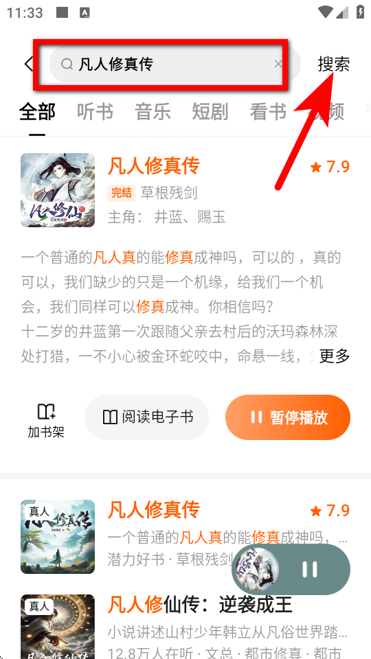 2、輸入小說名稱,如凡人修真?zhèn)?,點擊搜索按鈕,進(jìn)入搜索結(jié)果頁面。