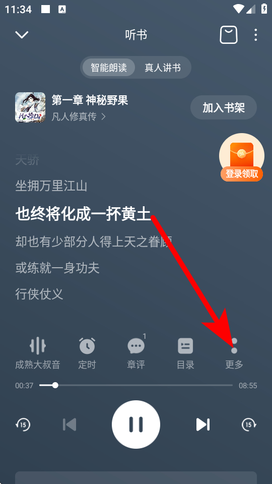 3、。在搜索結(jié)果頁面,點擊進(jìn)入小說聽書界面,點擊更多選項,彈出功能菜單。