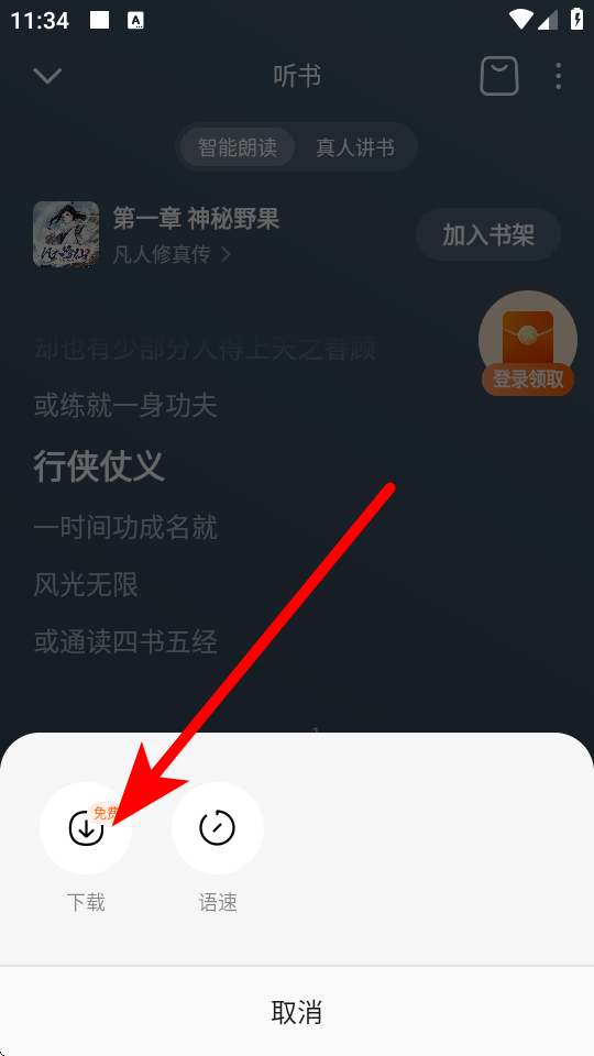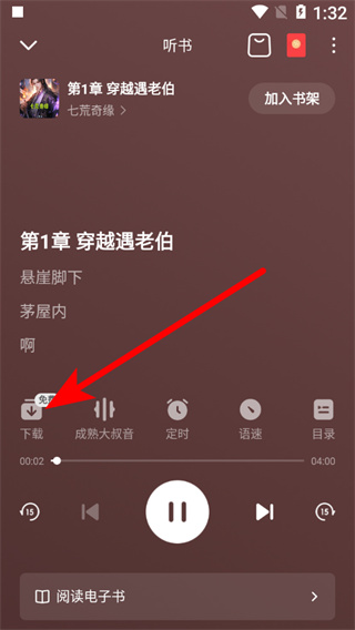 3、在聽書播放頁面,點擊下載選項,即可進(jìn)行小說下載操作。