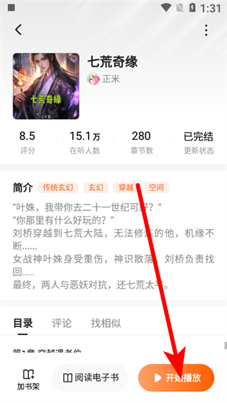 2、在小說詳情頁面,點擊開始播放按鈕,進(jìn)入聽書播放頁面。