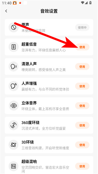 4、在音效設(shè)置界面,可選擇不同音效,點擊使用即可設(shè)置對應(yīng)音效。