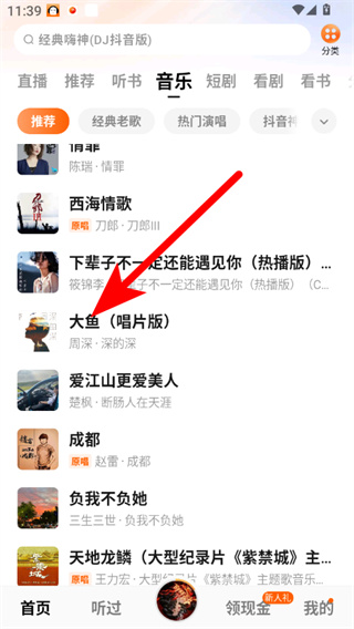 1、在番暢聽首頁,點擊音樂板塊,選擇想聽的歌曲進(jìn)入播放頁面。
