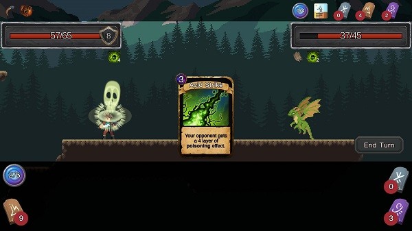擊敗怪物后,會有三張不同的卡牌供你選擇;每個地圖上存在泉水,在泉水中可以購買卡牌,刪除卡牌;擊敗boss后能在林中商店購買卡牌。