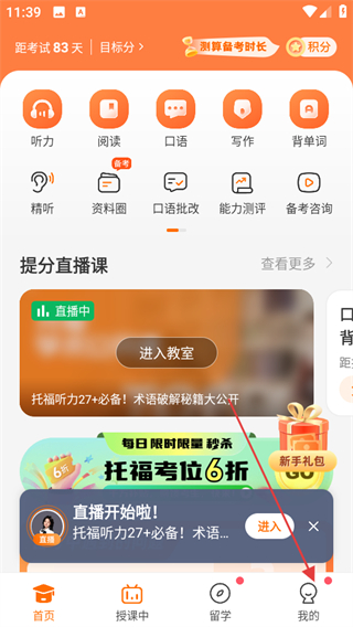 1、打開小站托福APP,點(diǎn)擊底部導(dǎo)航欄中的我的選項(xiàng)。