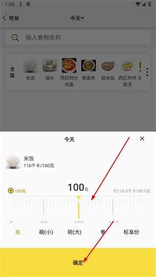 4、通過滑動數量選擇條或點擊加減按鈕,選擇攝入食物的重量,點擊確定按鈕。
