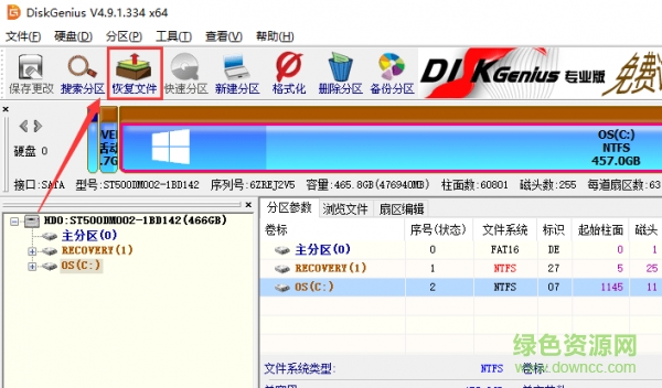 1.首先diskgenius,選擇需要恢復數據的系統(tǒng)盤,然后,上方的“點擊恢復”按鈕(如圖)。