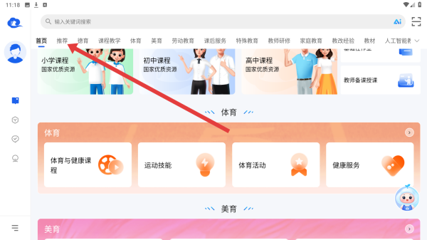 1、在智慧中小學(xué)首頁(yè),點(diǎn)擊頂部導(dǎo)航欄的推薦選項(xiàng),進(jìn)入推薦板塊,查看體育、美育等分類及活動(dòng)入口,開啟學(xué)習(xí)活動(dòng)探索。