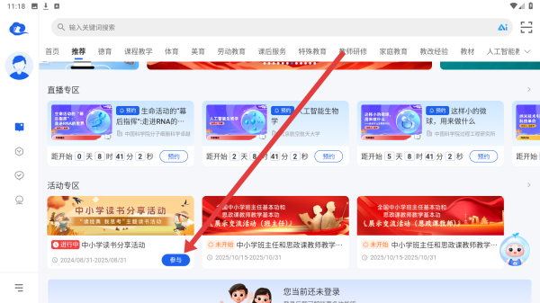 2、在推薦板塊的活動(dòng)專區(qū),找到目標(biāo)活動(dòng)如中小學(xué)班主任思政課教學(xué)活動(dòng),點(diǎn)擊參與按鈕,進(jìn)入活動(dòng)詳情頁(yè)面,準(zhǔn)備參與活動(dòng)。