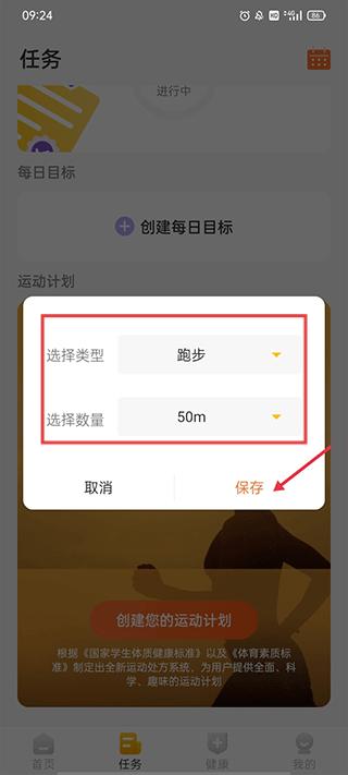 2、在彈出的選項框中選擇運動類型和數(shù)量,點擊保存。