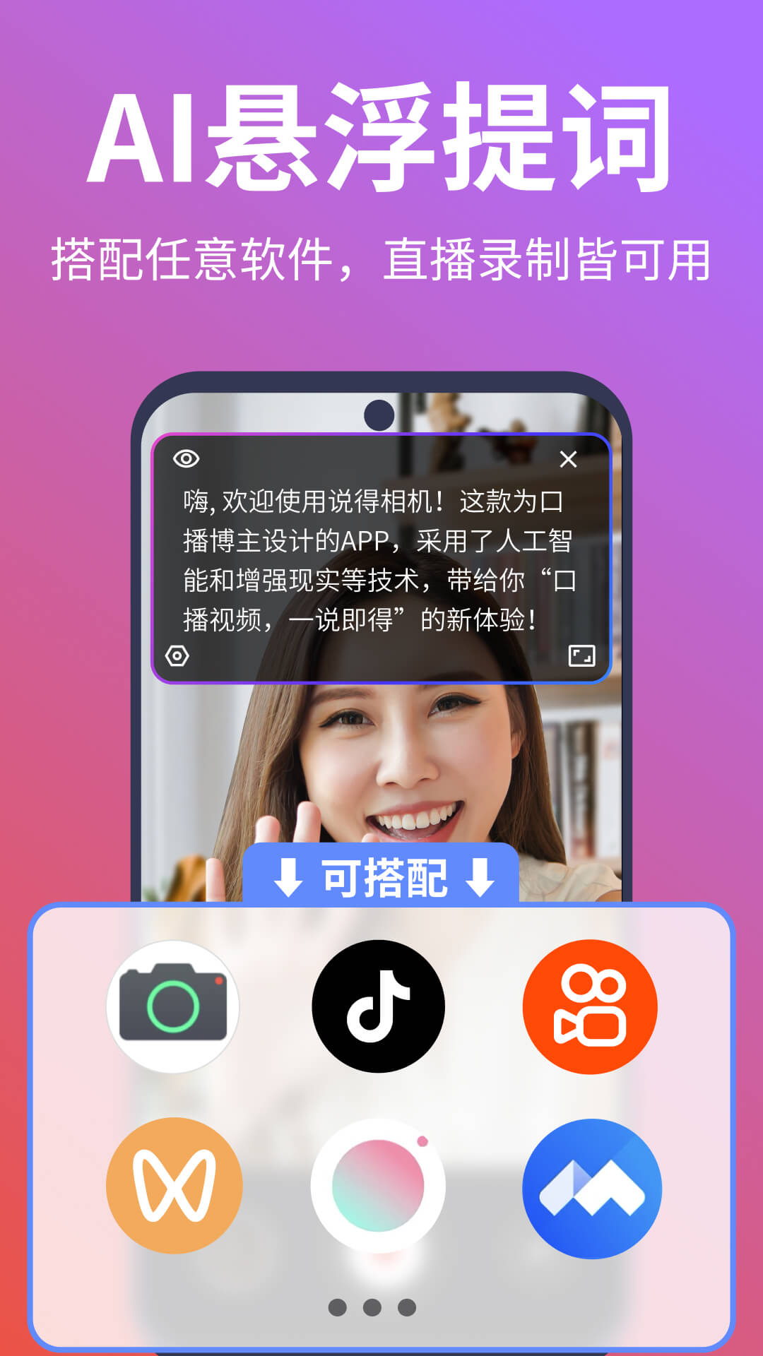 說得相機--口播視頻、一說即得!這是一款為口播視頻創(chuàng)作而生的智能拍攝工具,提供“AI提詞”、“AR演員”、“虛擬背景”、“分句拍攝”、“一鍵成片”、“美顏美妝””文案提取“等創(chuàng)新功能,不僅減輕口播創(chuàng)作者記詞和布景負擔,還提供豐富的3D虛擬演員,讓主播輕松就能拍出多人劇情,吸睛又圈粉??蓮V泛適用于知識分享、好物種草、脫口秀、情感講述等多種風格的口播創(chuàng)作。
